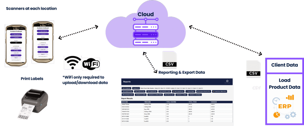 Devices scan data on-site, which syncs to the cloud via WiFi, then feeds into custom reporting dashboards like PowerBi. Reports are exported in client-preferred formats (CSV, XML) and integrated with your ERP or inventory system.